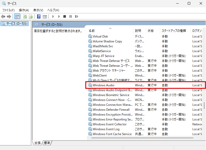 - 一覧から 「Windows Audio」 という項目を探す。